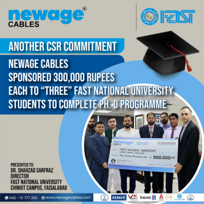 In a continued commitment to fostering education and innovation, Newage Cables has sponsored a total of 900,000 rupees, awarding 𝟑𝟎𝟎,𝟎𝟎𝟎 𝐫𝐮𝐩𝐞𝐞𝐬 each to three deserving Ph.D. students at FAST National University. This significant contribution underscores Newage Cables’ dedication to empowering the next generation of scholars and innovators, helping them achieve academic excellence and make a lasting impact in their respective fields.